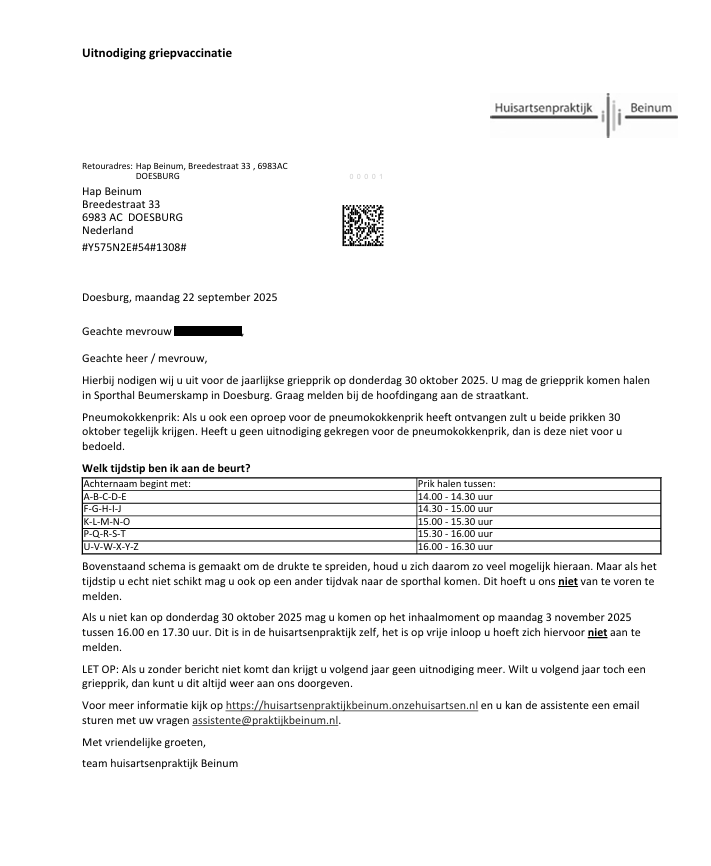 Als u in aanmerking komt voor de griep en-of pneumokokken prik dan krijgt u persoonlijk van ons een uitnodiging. De brief wordt per post verstuurd.